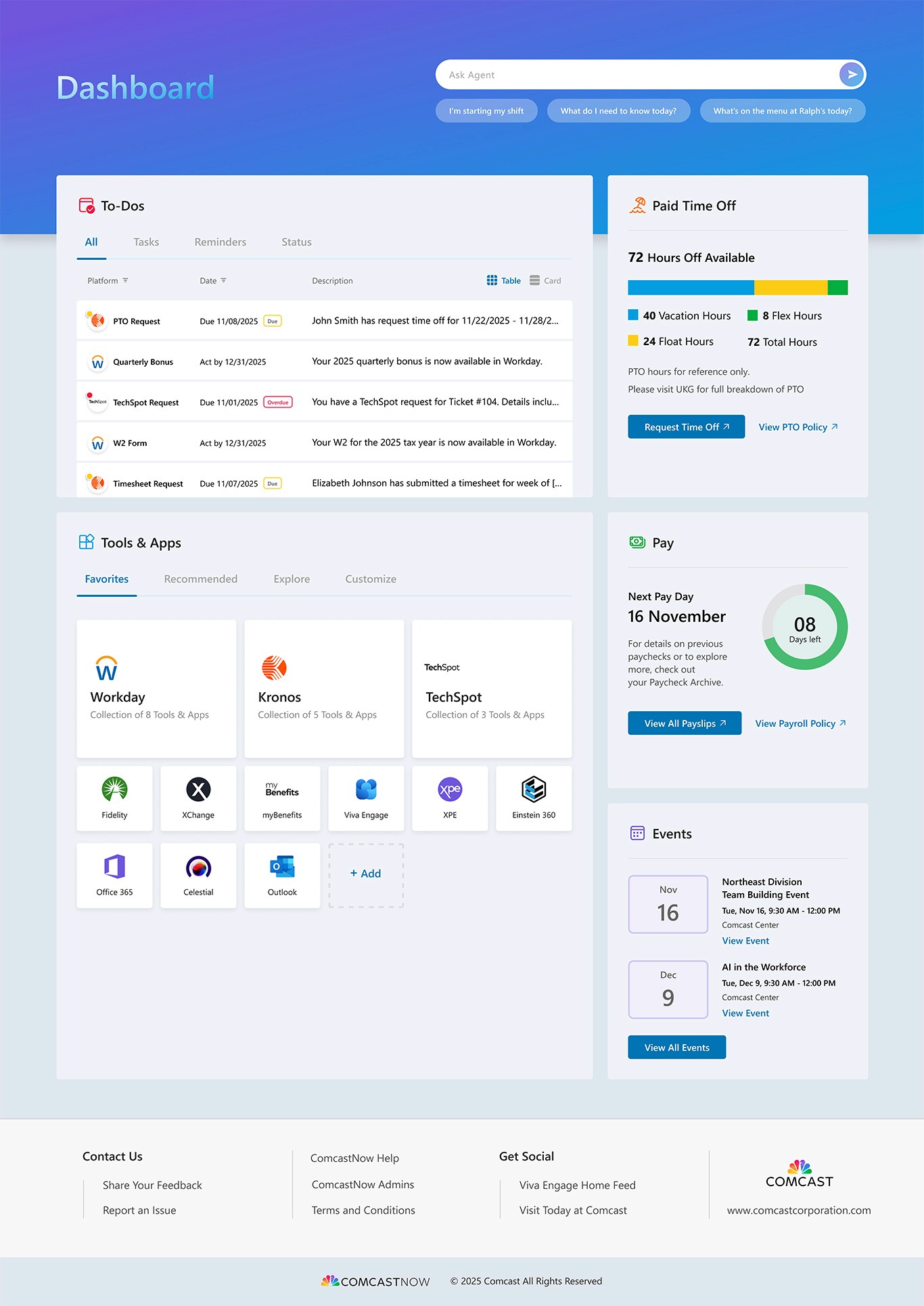 Comcast’s intranet had become fragmented, scattering tools, resources, and daily tasks across multiple pages and platforms. Employees had to jump between places to find information or take simple actions, slowing productivity and creating friction. The challenge was to unify these disconnected experiences into a single dashboard — one that integrated deeper with existing systems, introduced AI assistance, and made everyday administrative work feel seamless.