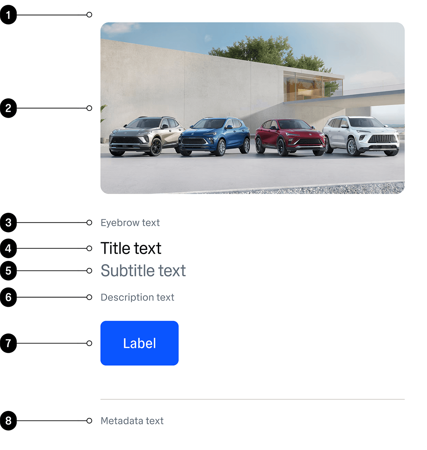 The card’s anatomy defines its foundational parts: container, media, content, and actions. This structure keeps the component flexible across use cases while maintaining consistency throughout the system.